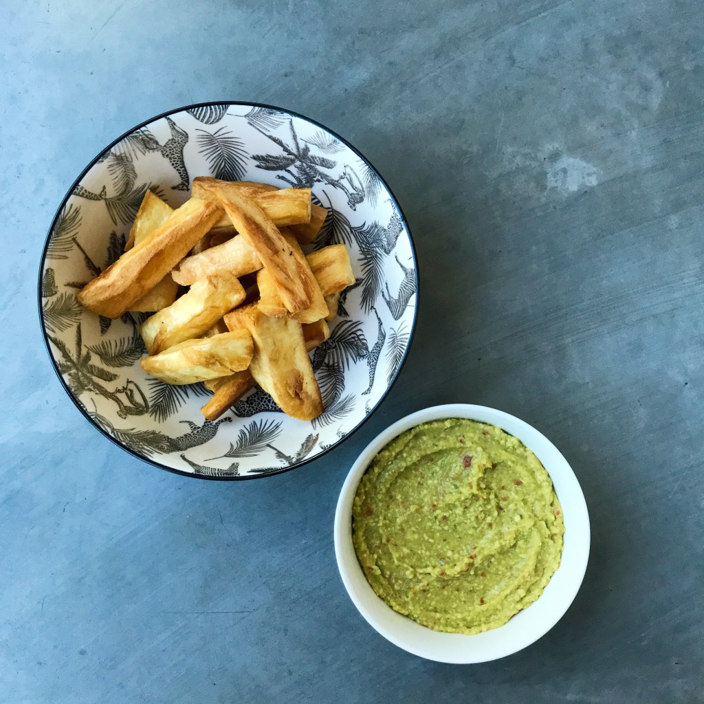 On plonge quelques frites de manioc à la fois dans la friteuse : en une seule couche. Et on les sort quand elles sont bien dorées ! À déguster avec un petit guacamole des familles (ou de la mayonnaise) : pour ça, je mixe une tomate avec un demi-oignon et les épices puis je rajoute l’avocat pour ne pas qu’il soit trop mixé !